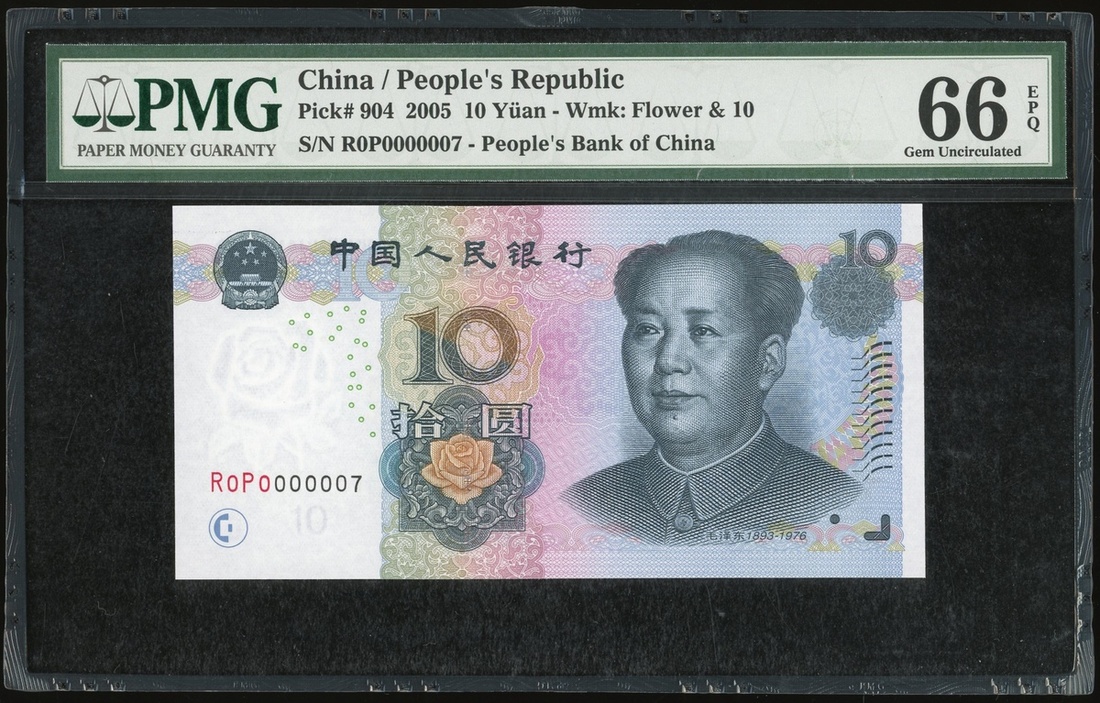 People's Bank of China, 5th series renminbi, 2005, 10 Yuan, low serial R0P0000007,