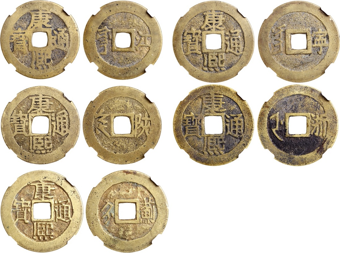 Qing Dynasty, Kangxi Tong Bao, group of 5x 1 cash, 'Jiang', 'Ji', 'Ning', 'Shaan' and 'Zhe',