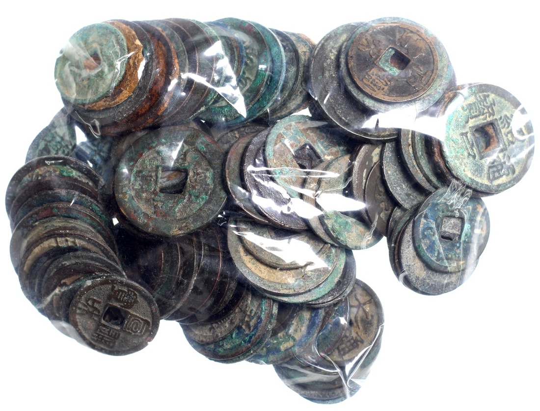Chinese Cash Coins, an accumulation of 111 coins from different dynasties, mainly Tang and Song, reviewed by Zhong Qian and guaranteed genuine. Returns are not accepted due to the large volume (111)
