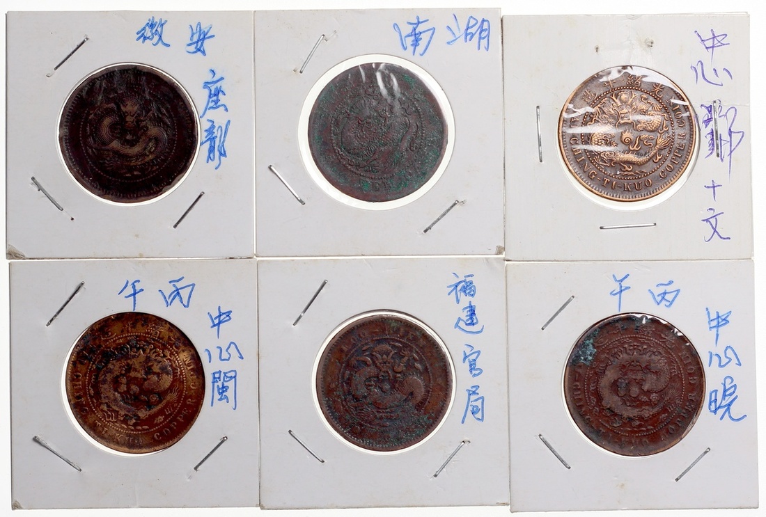 Qing Dynasty, a group of 6x copper 10 cash, Guangxu Yuan Bao or Tai Ching Copper Coin, consisting of Anhwei, Hunan, Hupeh and Fukien provinces, one Anhwei with scratch on obverse, others cleaned or with patination, fine to very fine.(6) Sold as is, no return