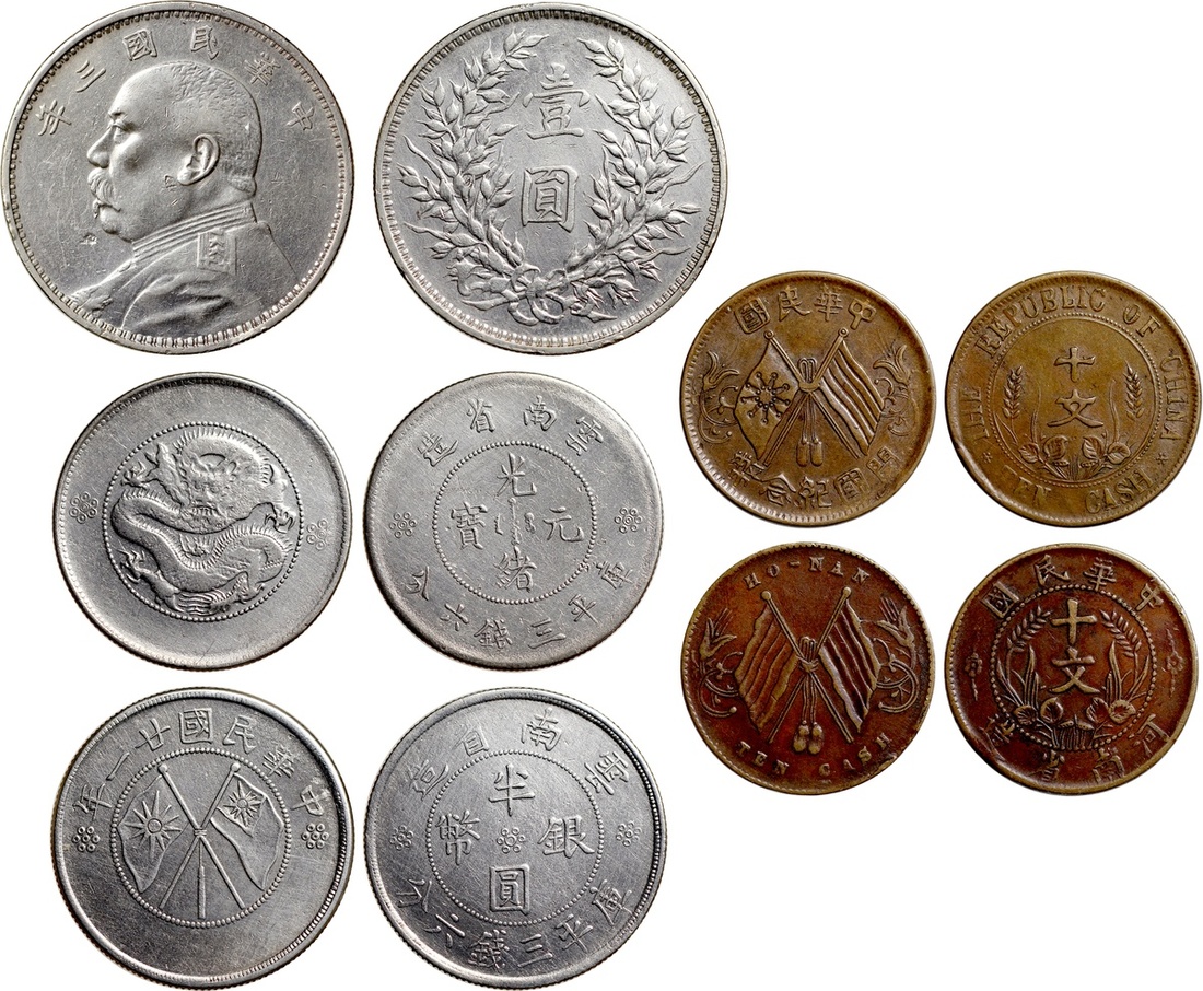 Republic of China, group of 5 coins, including silver 'Fatman' dollar, 1914, Yunnan Province silver 50 cents (2), etc,