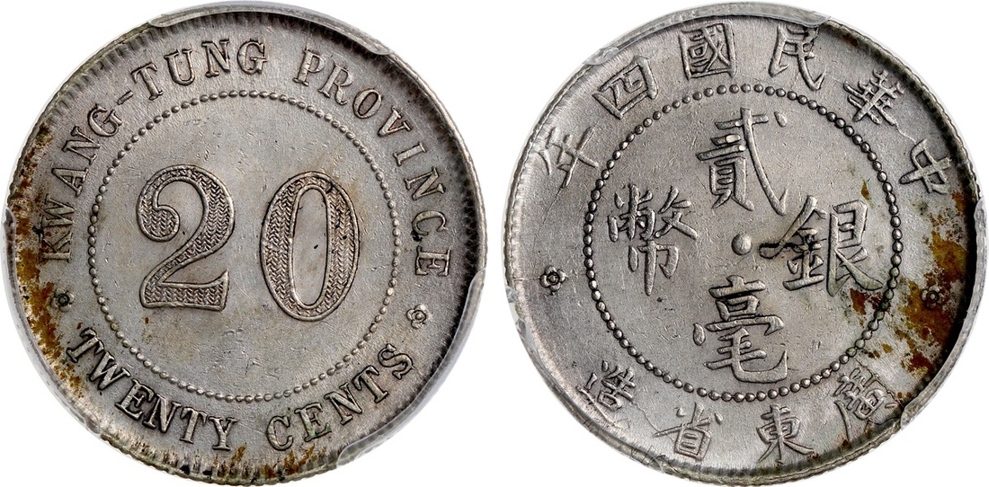 Kwangtung Province, silver 20 cents, Year 4 of Republic, 1915, key date, PCGS AU Detail, harshly cleaned.