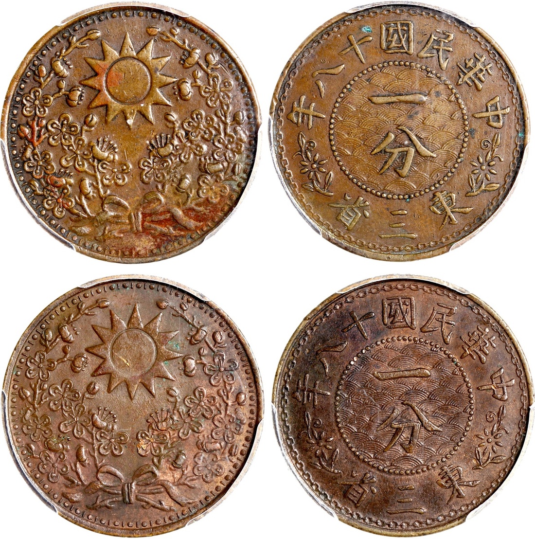 China, Republic, a pair of bronze 1 fen, Manchurian Province, Year 18(1929), PCGS AU Detail, environmental damage and AU58.(2)
