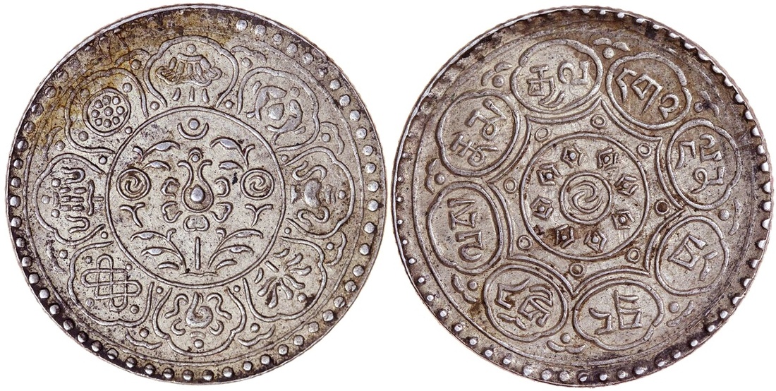 The Tibetans referred to this Tangka as Tangka dkarpo sarpa ("new white Tangka") in order to distinguish it from the normal Gaden Tangkas. This coin circulated for some time at the value of 5-Srang which shows the high inflation rate which was prevailing in Tibet in the 20th Century. In the 19th Century 6 2/3 Tangkas were equivalent to 1-Srang which corresponded to slightly more than 37 grams of silver. Taking the circulating value of this Monk Tangka as a base, 1-Srang was equal to about 33 1/3 Tangkas in 1953/54.
