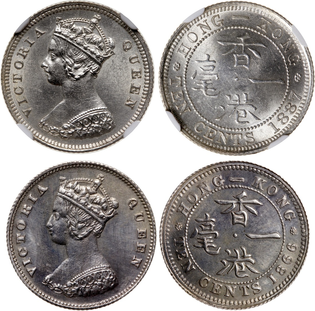 Hong Kong, silver 10 cents, 1866 and 1887, Victoria on obverse,