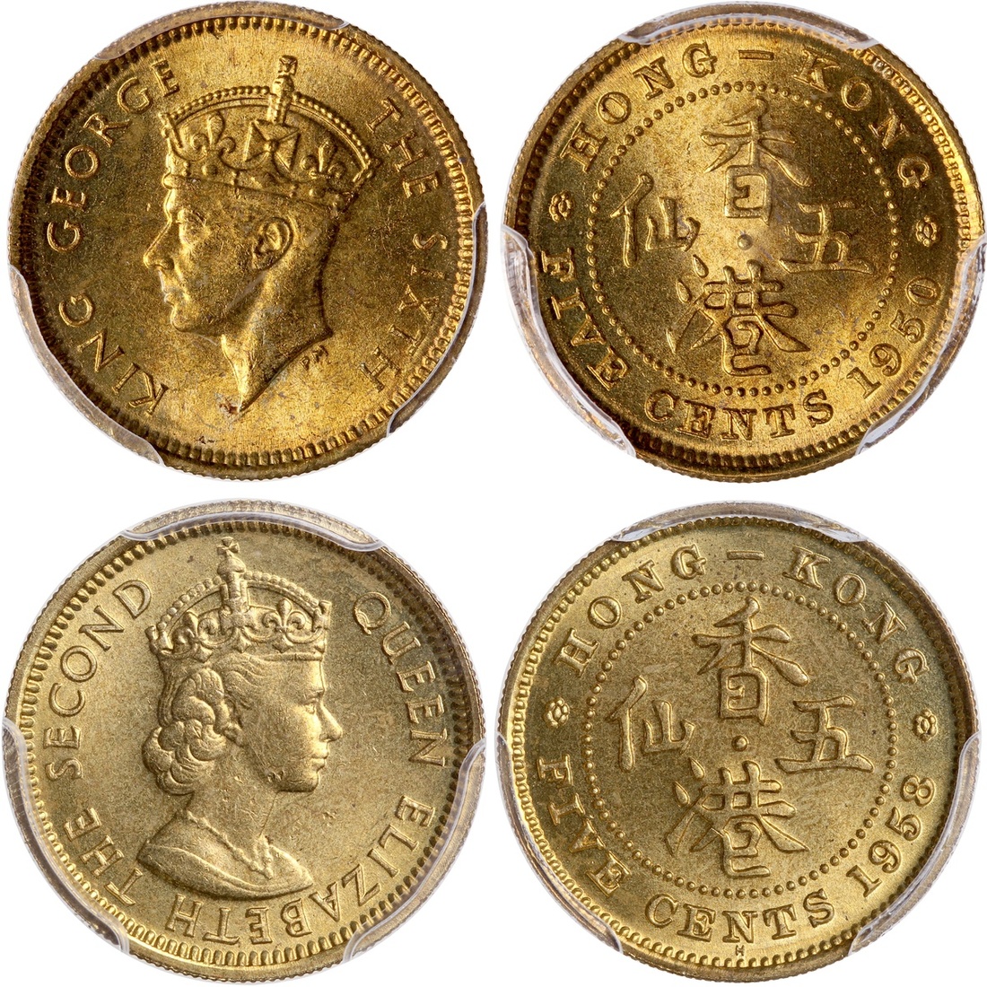 Hong Kong, brass 5 cents, 1950 and 1958-H, both graded PCGS MS64 (2)