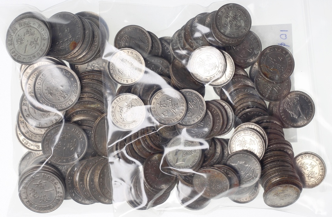 Hong Kong, a large group of 145x silver coins, all George VI issue, consisting of: 5 cents, 1937 (5), 1938 (58) and 1939 (35),