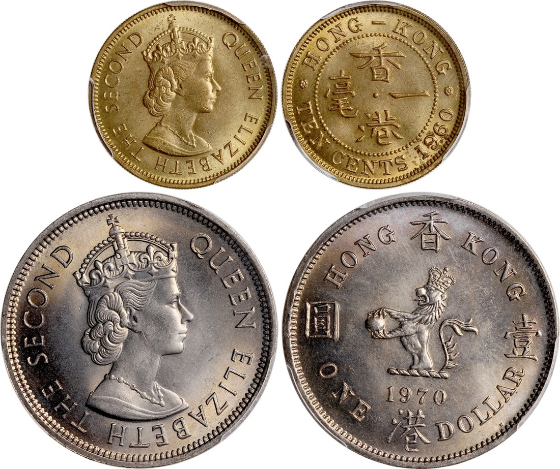 Hong Kong, nickel-brass 10 cents, 1960-H and cupro-nickel $1, 1970-H, graded PCGS MS65 and MS66 (2)
