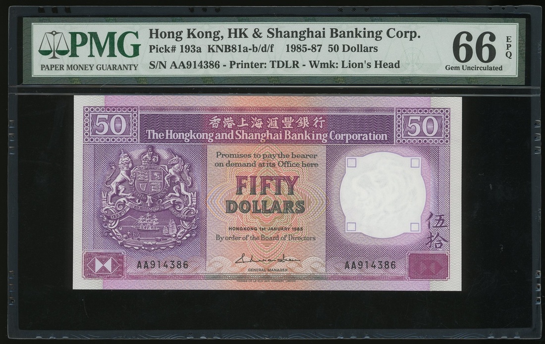 The Hongkong and Shanghai Banking Corporation, $50, 1.1.1985, serial number AA914386, (Pick 193a), PMG 66EPQ Gem Uncirculated