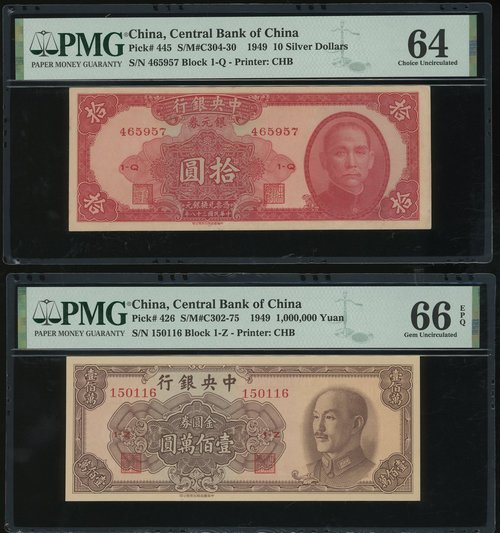 1949年中央銀行10銀元及1000000元,編號465957及150116,分別評PMG 64及66EPQ