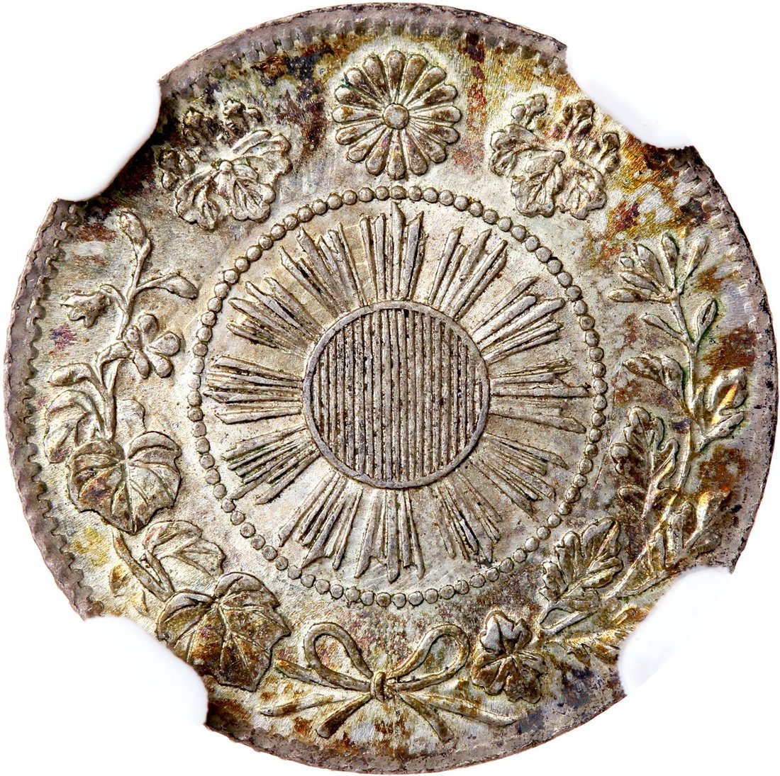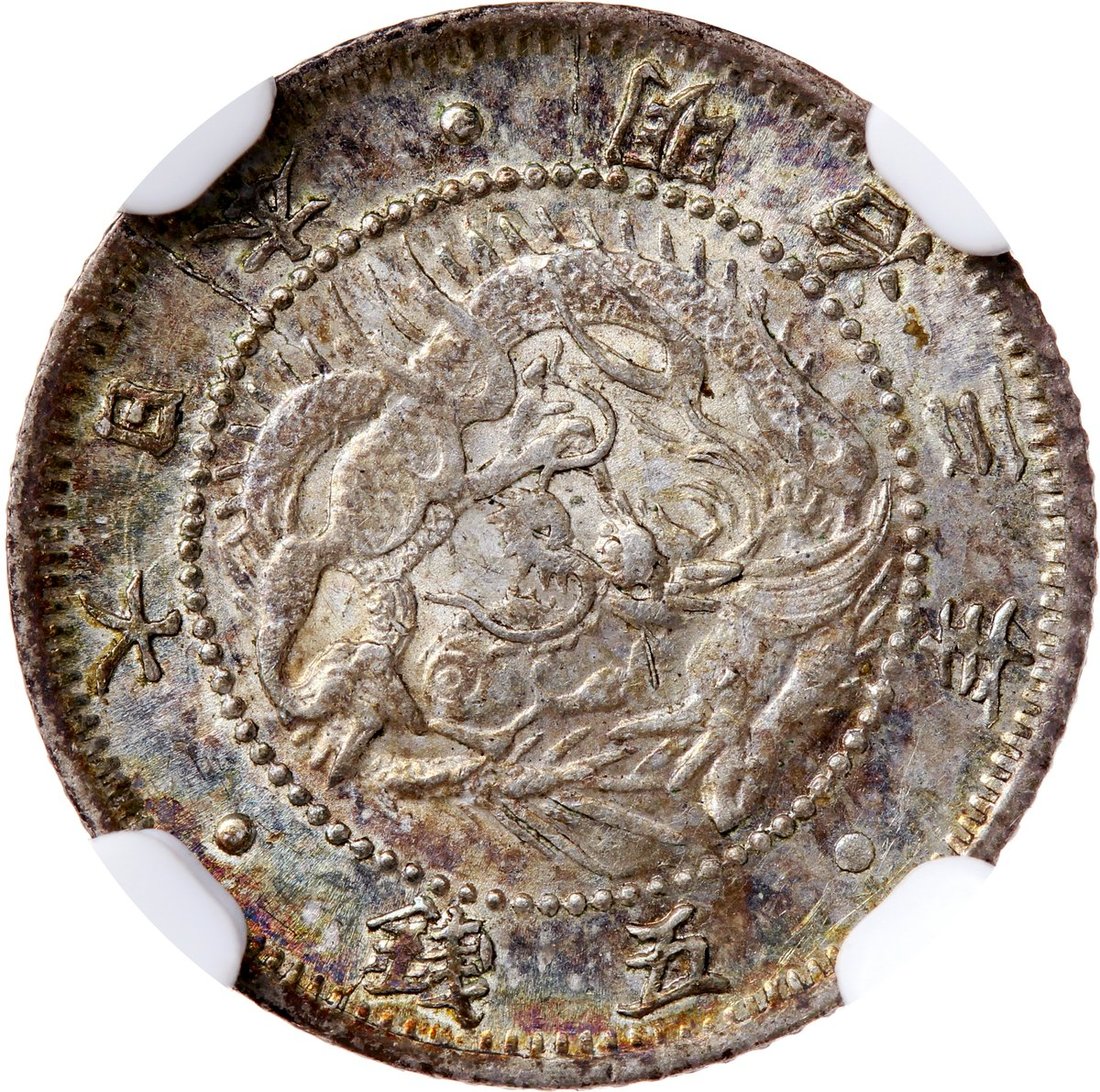 Japan, silver 5 sen, Meiji Year 3(1870), coiled dragon on obverse, shallow scales, NGC MS64.