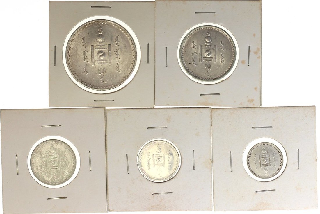 Mongolia, a set of silver coins from the series of 1925, 10, 15, 20, 50 mongo and 1 togrog,