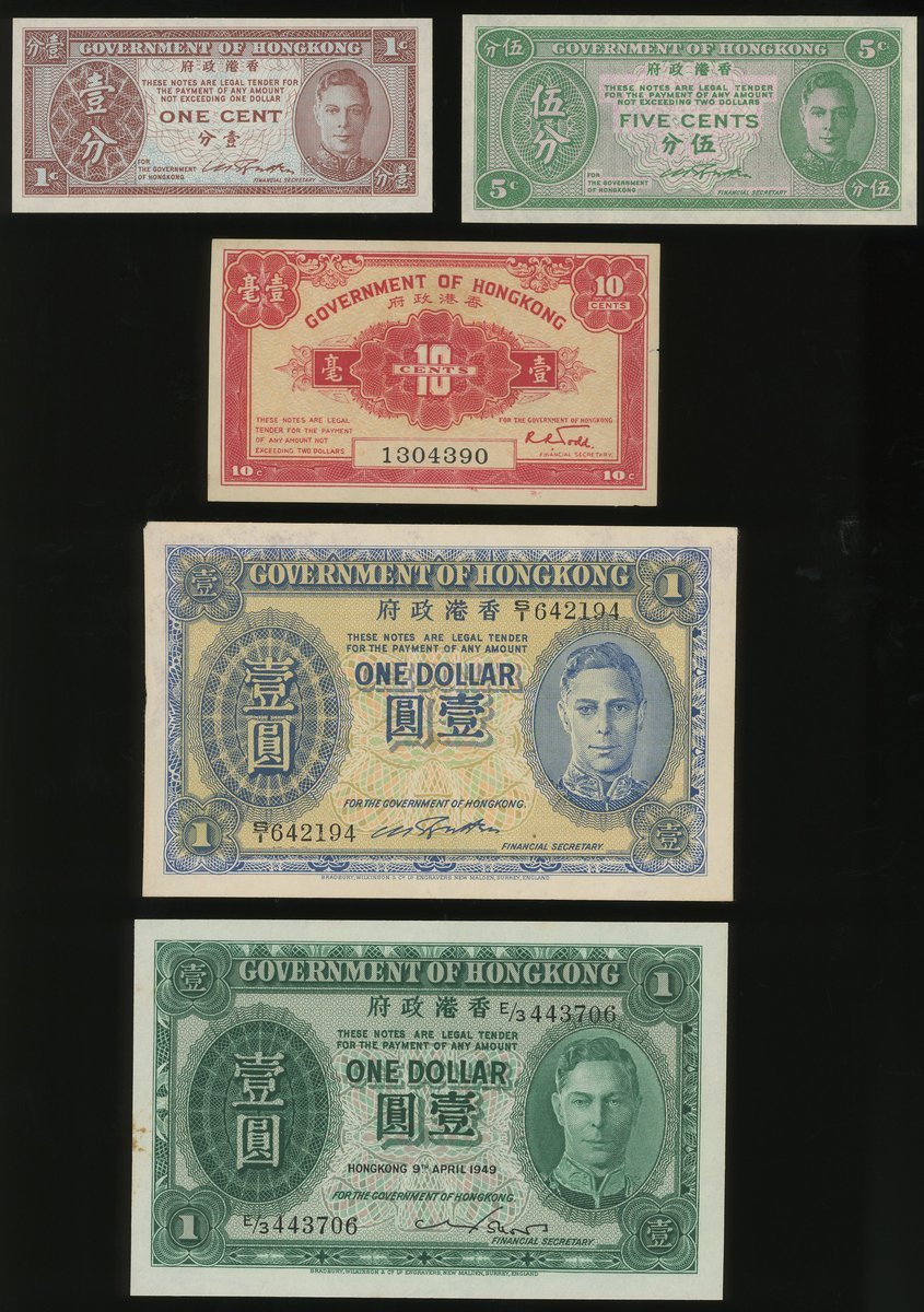 Government of Hong Kong, group of notes, 1940's: 1, 5 and 10 cents, $1, 1940 and 1949 and also 1950's 1 cent (13). 5 cents (2), 10 cents (2) and $1, 1959,