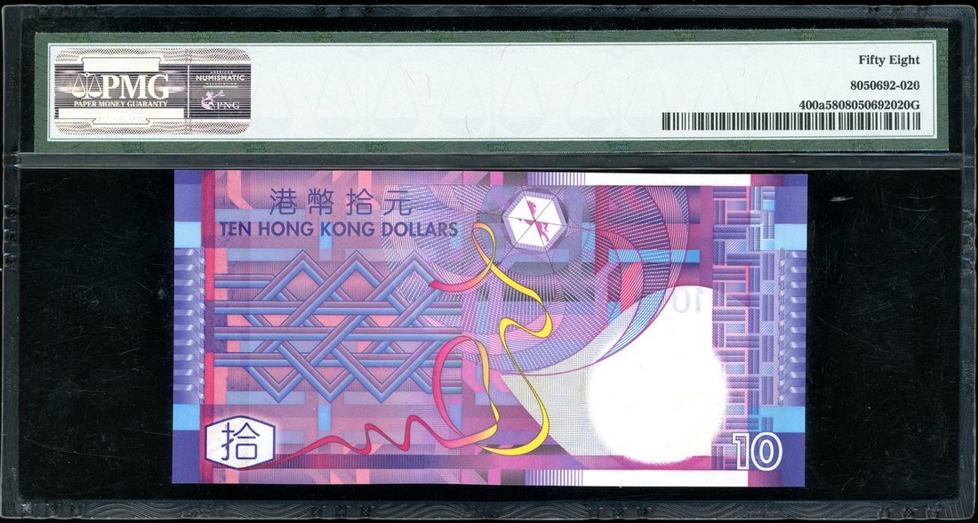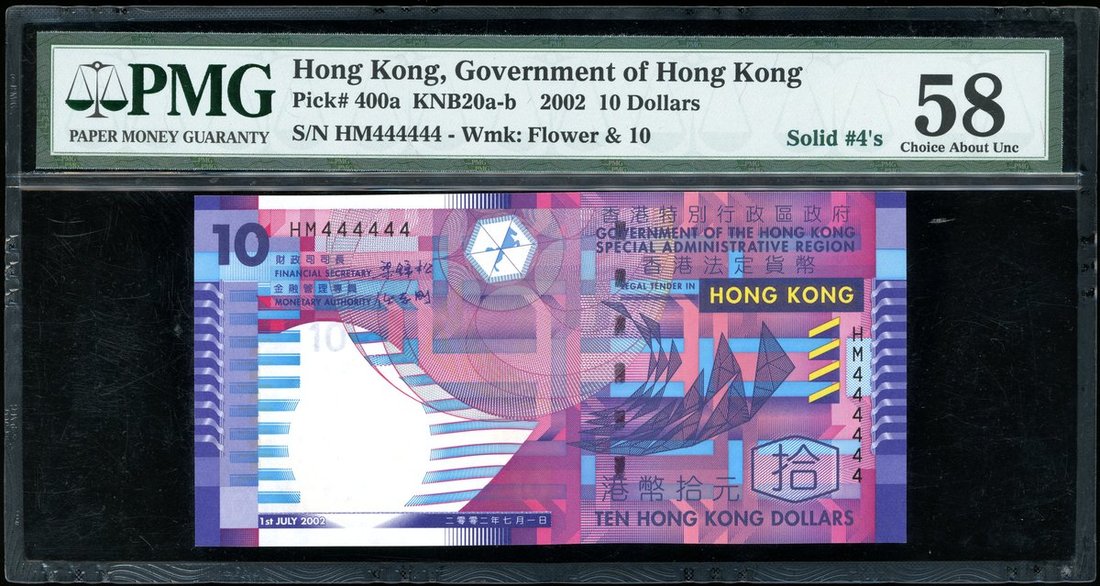 Government of Hong Kong, $10, 1.7.2002, solid serial number HM444444, (Pick 400a), PMG 58 Choice About Uncirculated