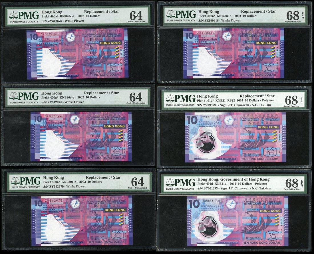 香港政府10元6枚,補號5枚,ZY312674,678,679,ZZ190416,雷達號ZV335533及趣味號BC001333,頭3枚評PMG 64,其餘68EPQ