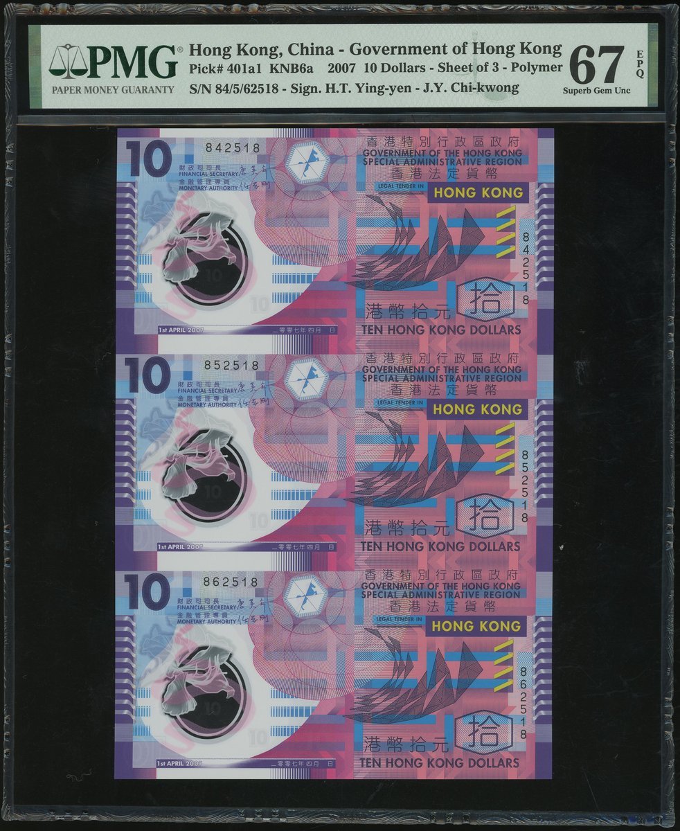 2007年香港政府公益金籌款10元3連體,編號842518/852518/862518,PMG 67EPQ,連原封套