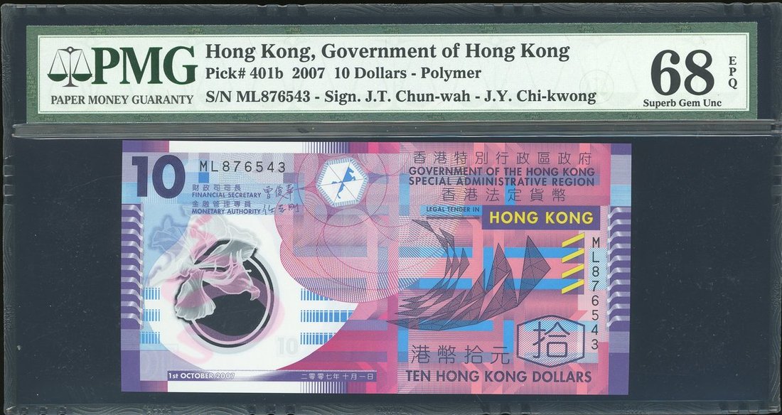 Government of Hong Kong, $10, 1.7.2007, descending ladder serial ML876543, (Pick 401b), PMG 68EPQ Superb Gem Uncirculated