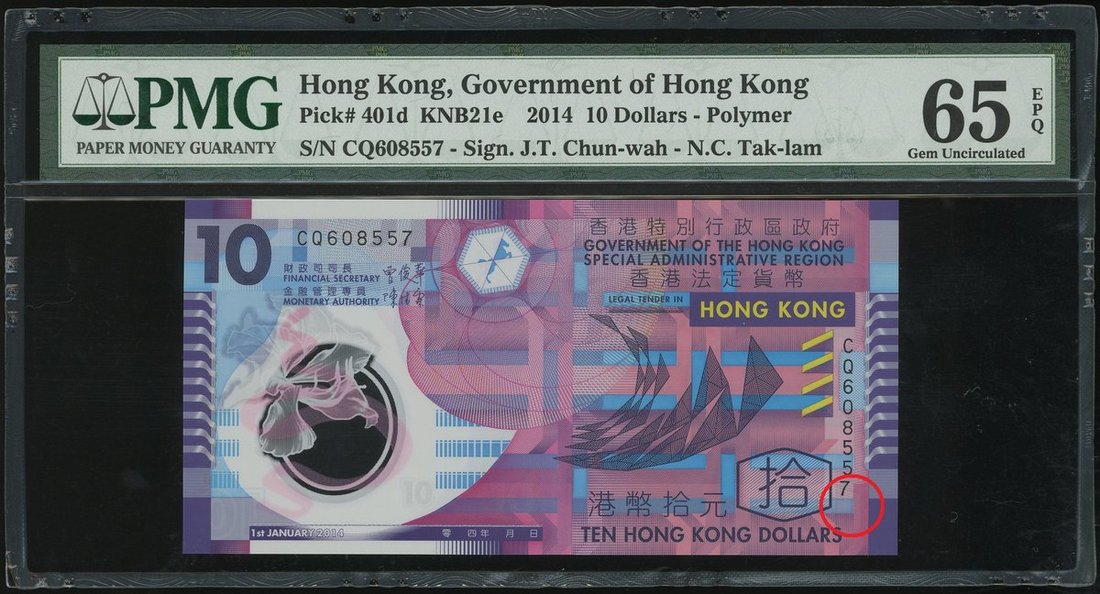 2014年香港政府10元,右邊號碼印刷錯體,編號CQ608557,PMG 65EPQ,標籤未有標明為錯體票,成功拍得後不可以此理由要求退換