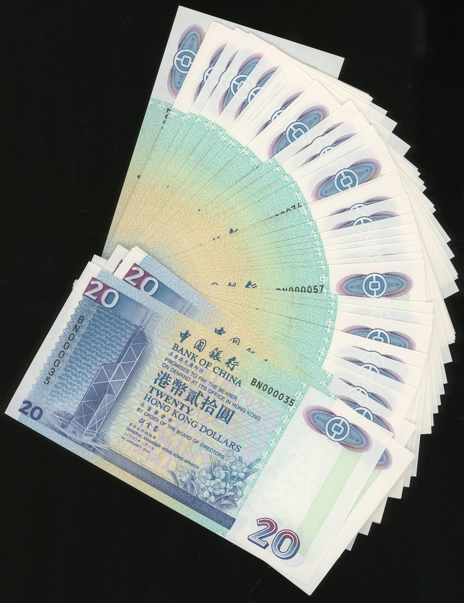 2000年中國銀行20元連號47枚,細號介乎BN000035-97,部份跳號,面值940元,UNC,若干有輕微黃點