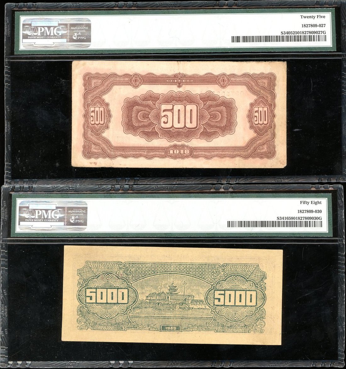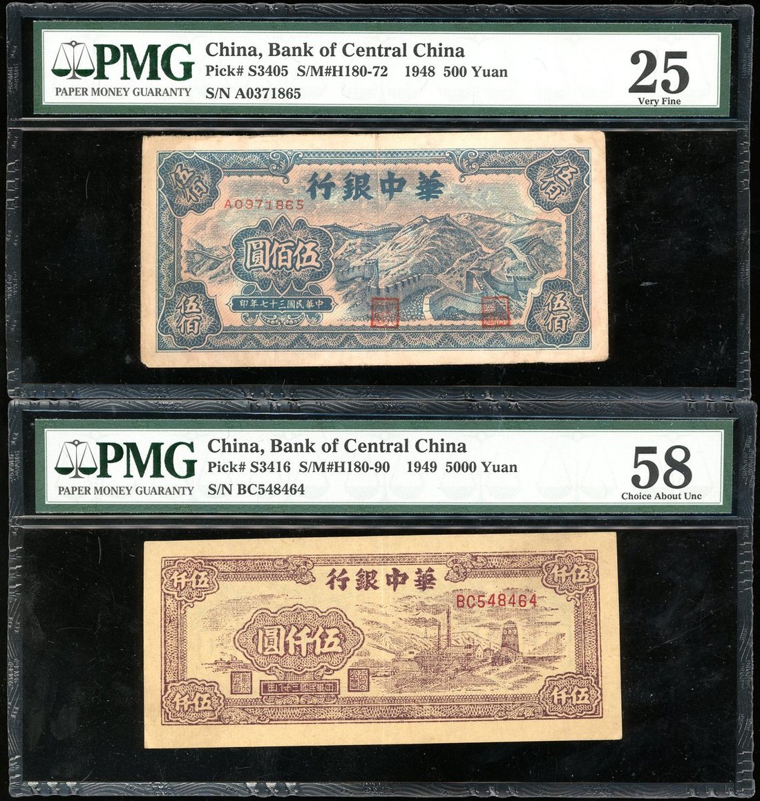 1948年中央銀行500元及5000元,編號A0971865及BC548464,分別評PMG 25及58