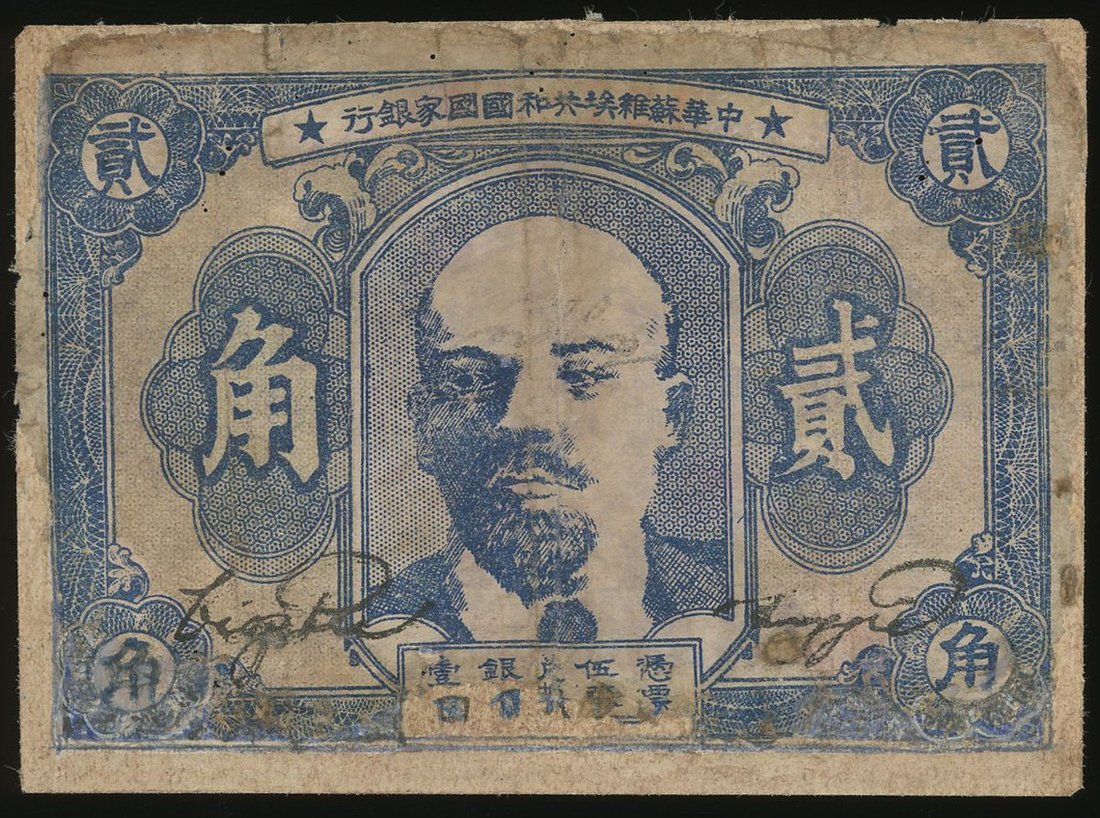 Chinese Soviet Republic National Bank, 2 chiao, 1934, serial number 327829, blue, Lenin on obverse, reverse purple,