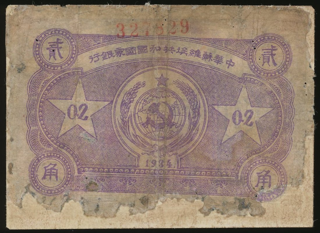 1934年中華蘇維埃共和國國家銀行2角,列寧像,編號327829,邊緣有嚴重修補,G品相