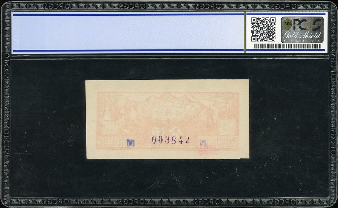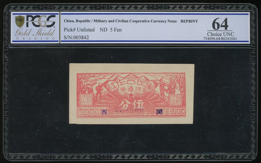 軍民合作社流通券5分,無日期 ,編號003842,單面印刷,後印版,PCGS Gold Shield 64