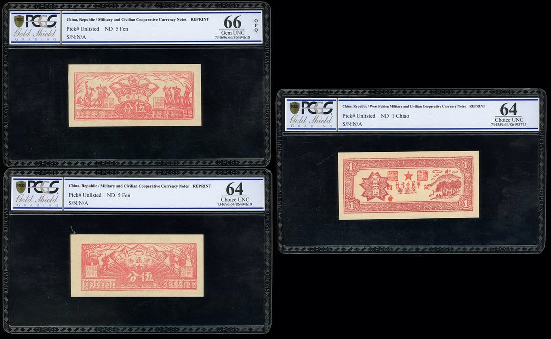 軍民合作社流通券3枚一組,包括5分2枚及1角,無日期及編號,單面印刷,均後印版,分別評PCGS Gold Shield 64,66OPQ及64