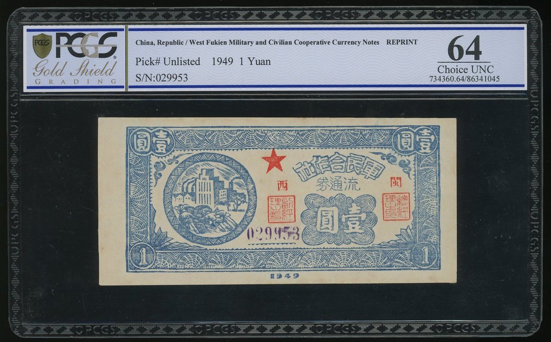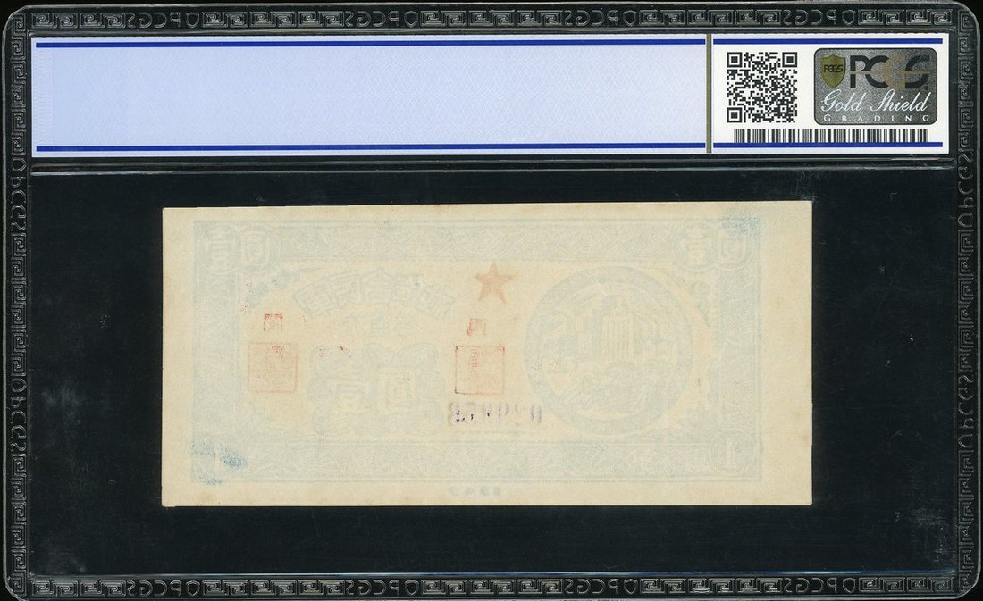 1949年軍民合作社流通券1元,編號029953,單面印刷,後印版,PCGS Gold Shield 64