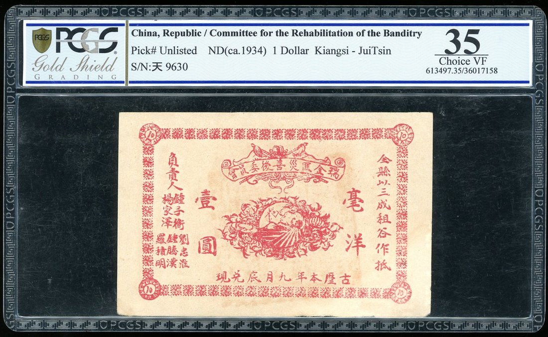 民國時期(約1934年)瑞金匪災善後委員會1元,編號天字9630,PCGS Gold Shield 35