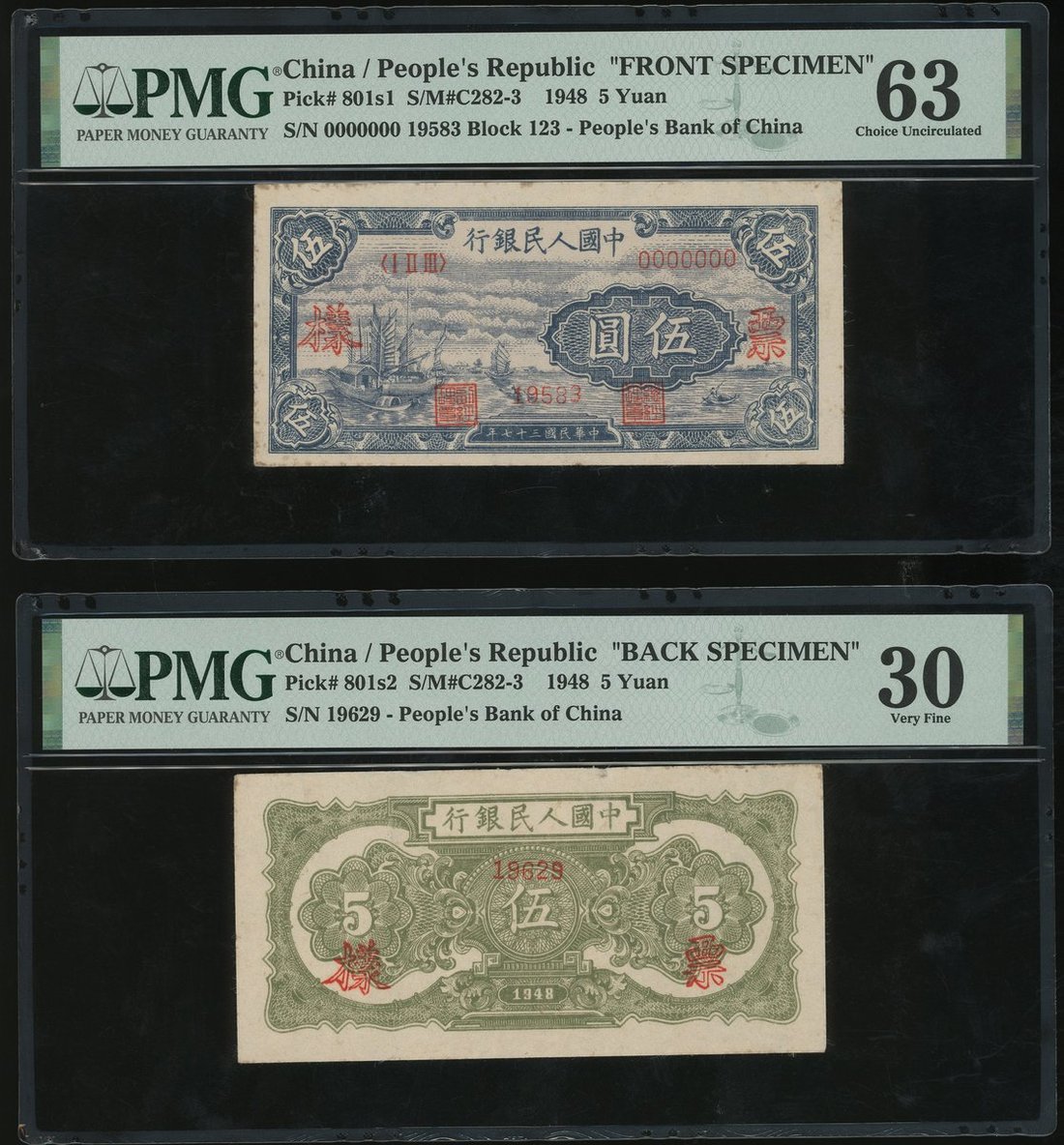 中國人民銀行第一版人民幣5元「小帆船」正反面樣票一對,控號19583/19629,分別評PMG63及30有貼痕