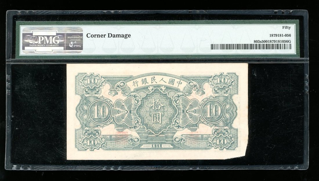 中國人民銀行一版人民幣10元「灌田」樣票, 控號019655,PMG50,紙角有損