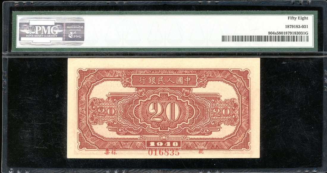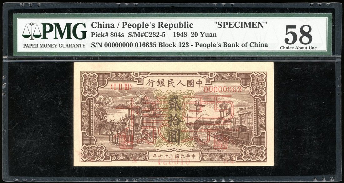 中國人民銀行第一版人民幣20元「驢子與火車」樣票,控號016835,PMG 58