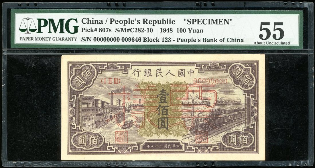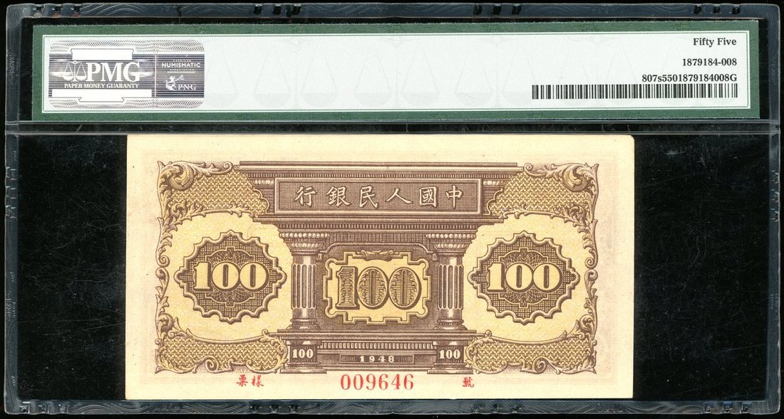 中國人民銀行第一版人民幣100元「黑工廠」樣票,控號009646,PMG 55
