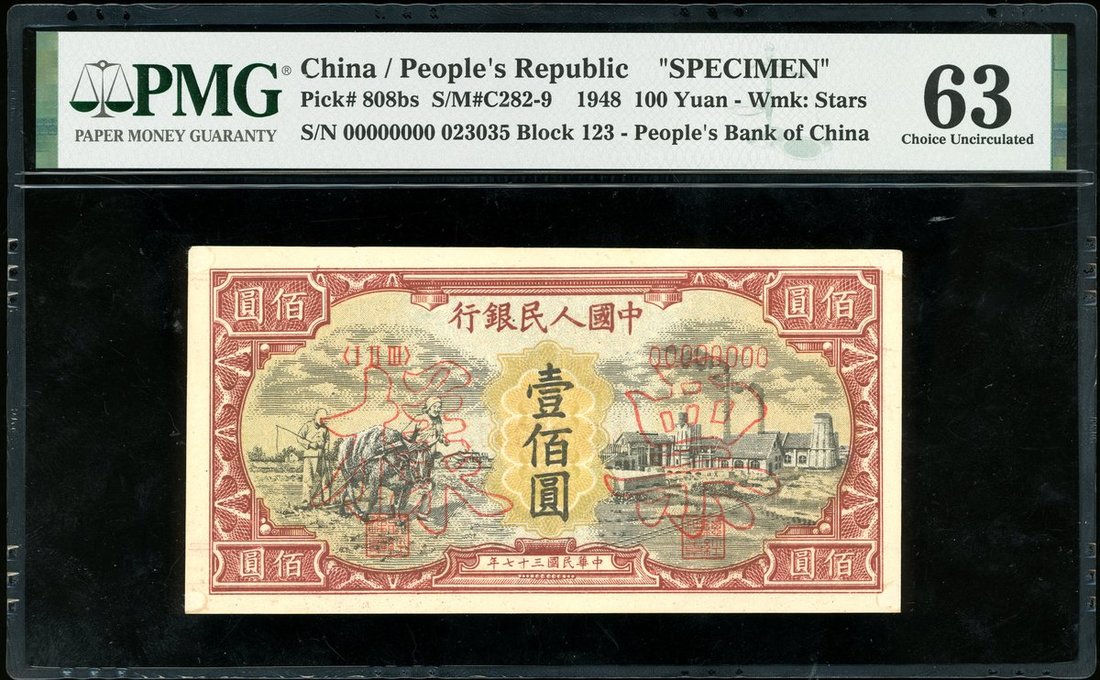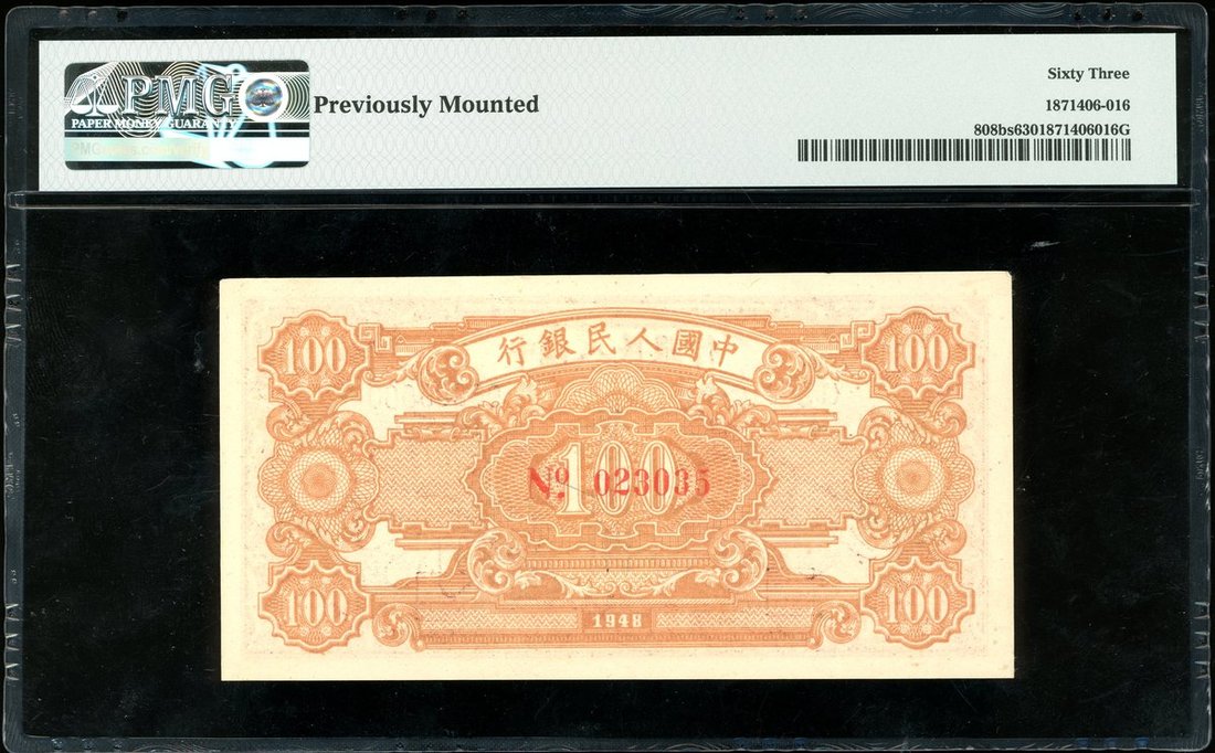 中國人民銀行第一版人民幣100元「驢子與工廠」樣票,控號023035,PMG 63,有貼痕