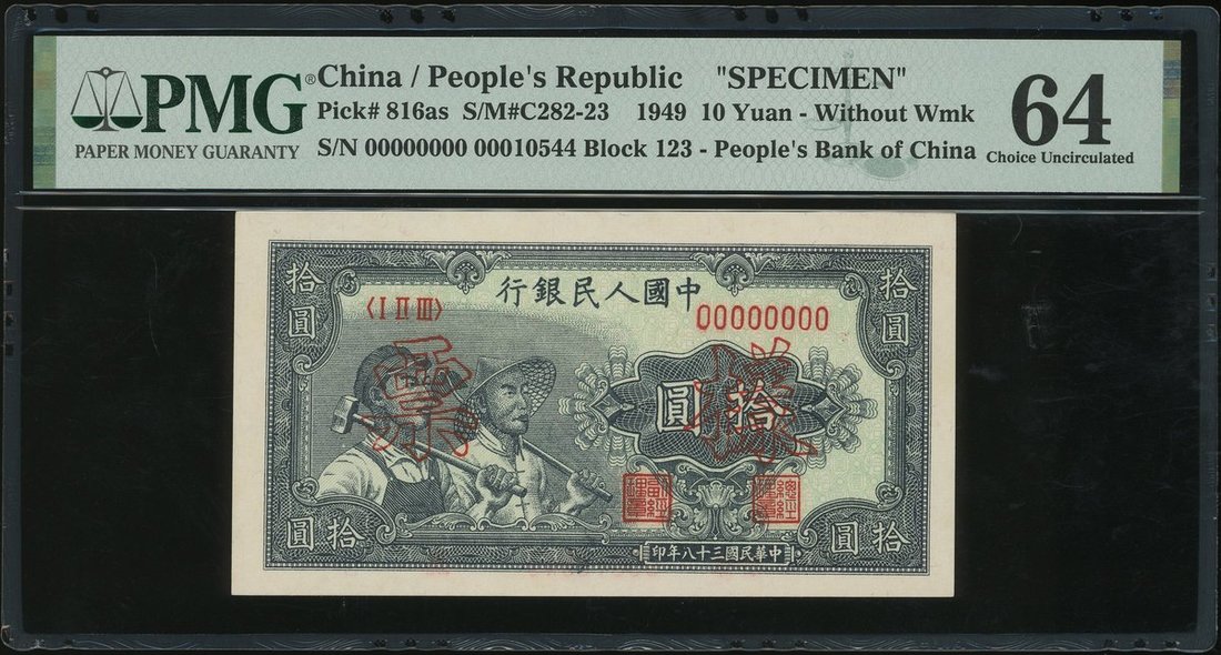 People's Bank of China, 1st series renminbi, 1948-1949, 10 yuan, specimen, 'Farmer and Factory Worker', control number 00010544,
