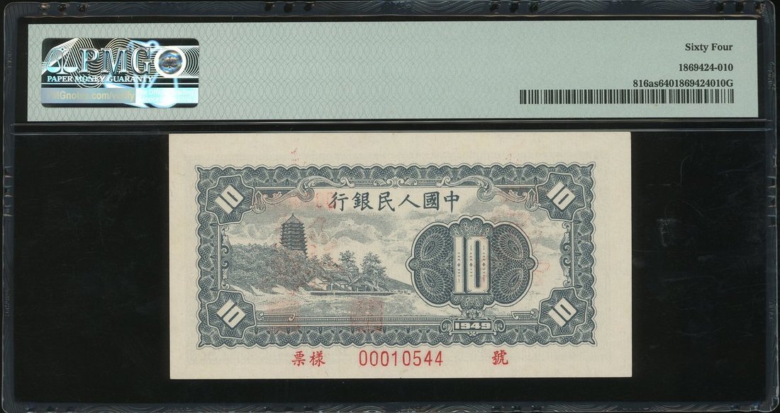 中國人民銀行第一版人民幣10元「農民與工人」樣票,控號00010544,PMG64