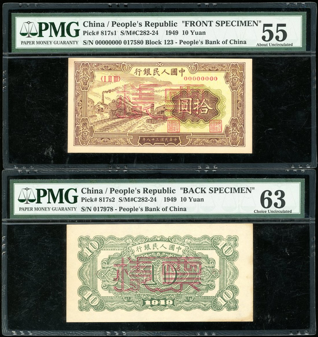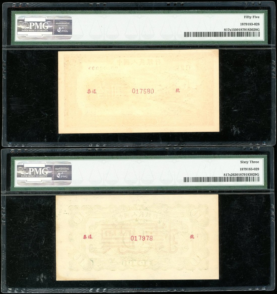 中國人民銀行第一版人民幣10元「黃火車」正反面樣票一對,控號017580/017978,分別評PMG 55及63