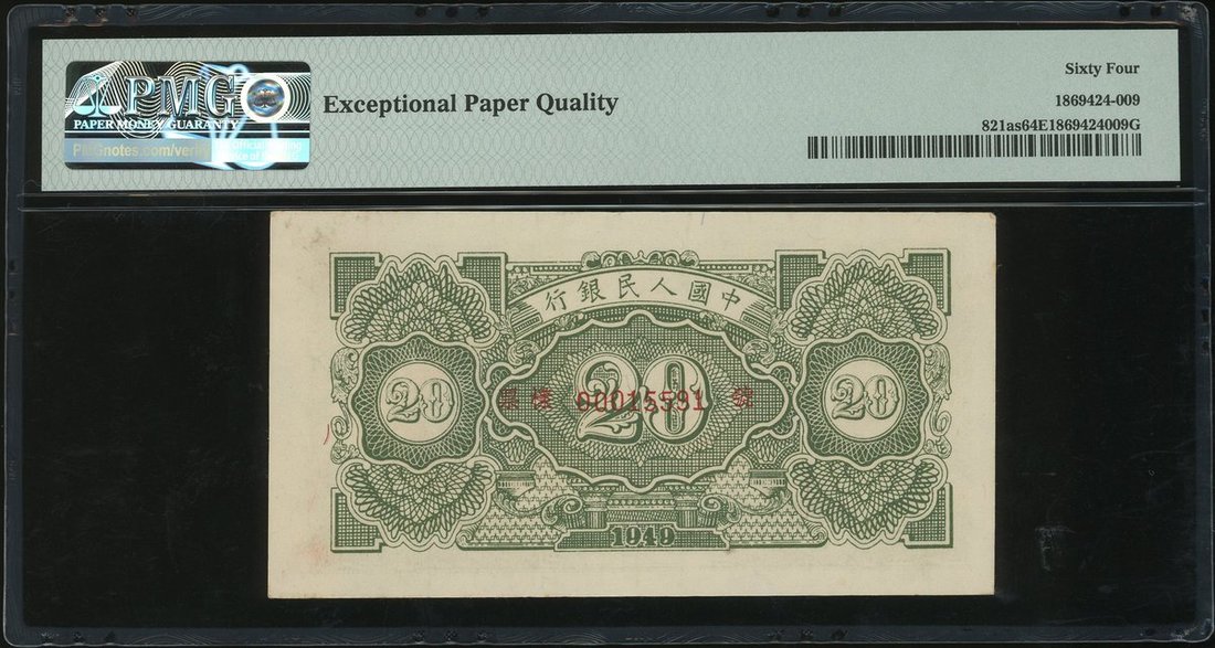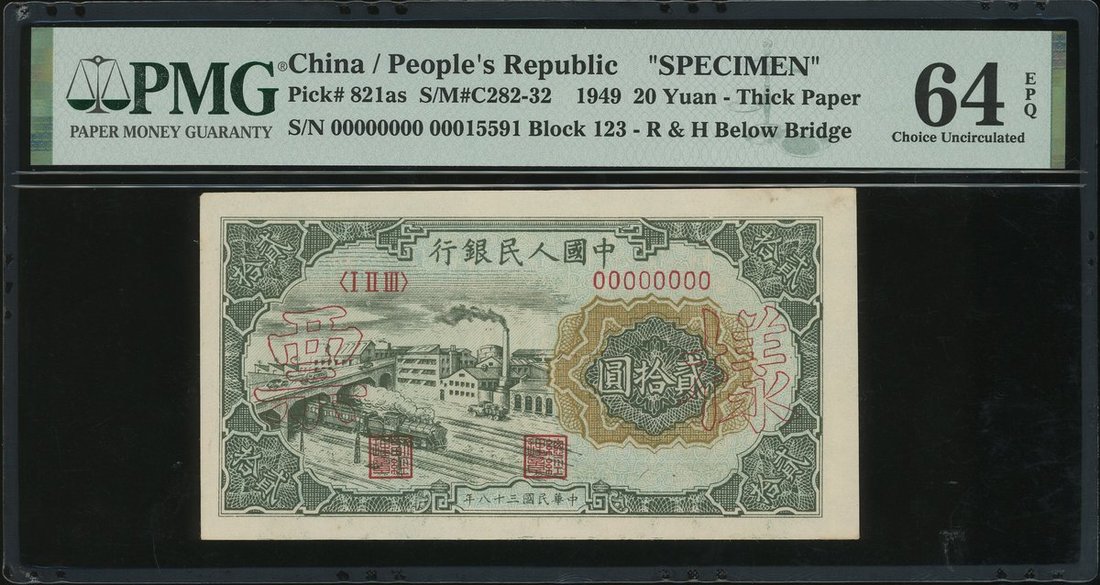 中國人民銀行第一版人民幣20元「立交橋」樣票,控號00015591, PMG64EPQ