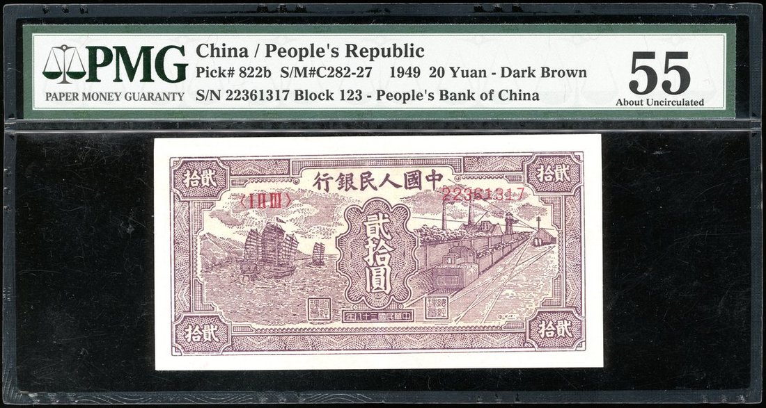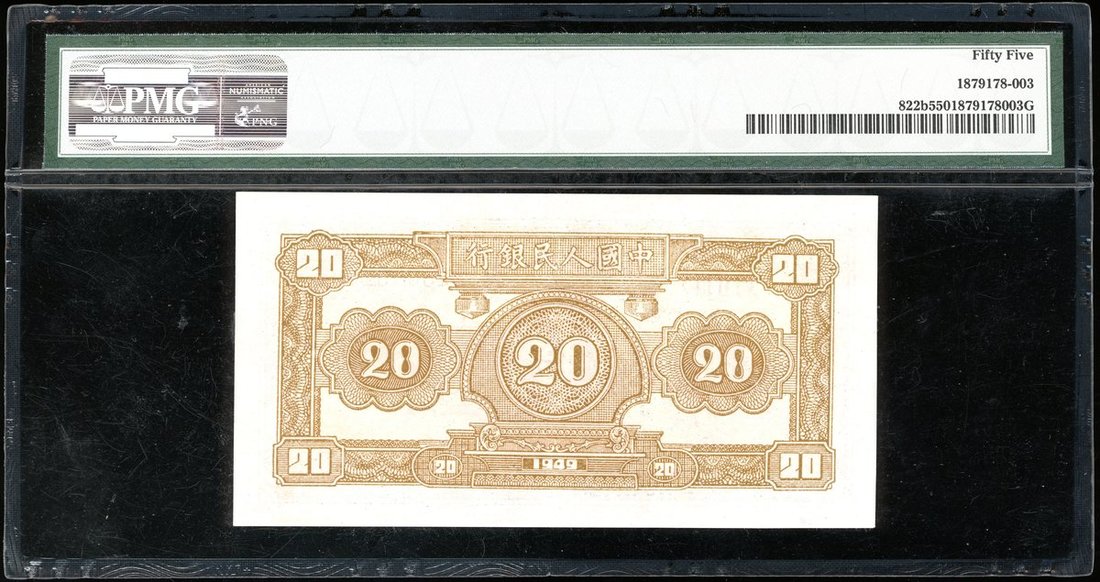 中國人民銀行第一版人民幣20元「帆船」,編號 22361317,PMG 55,較罕見版別