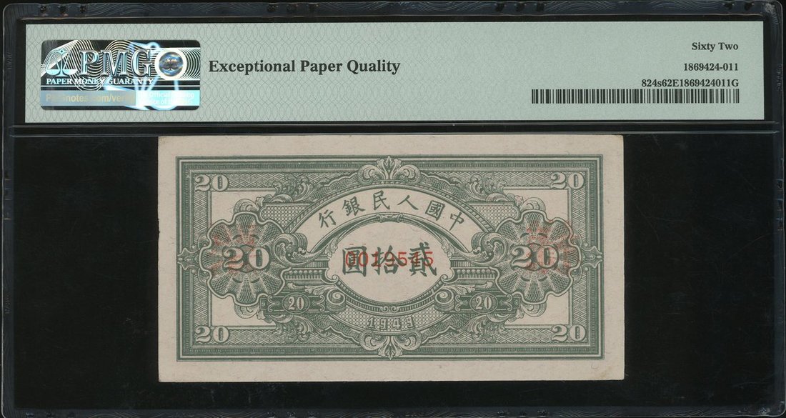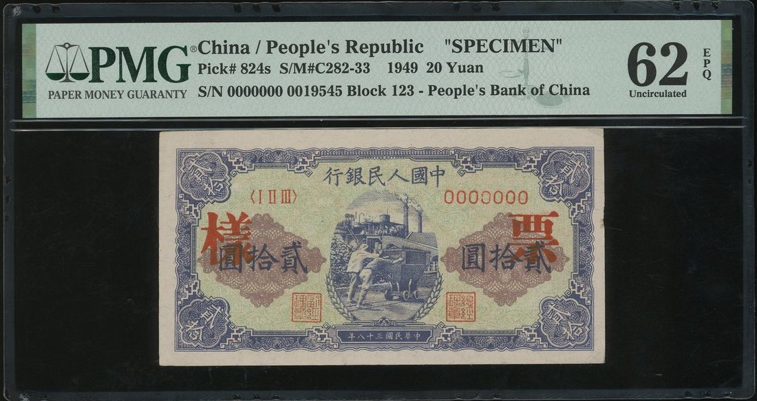 中國人民銀行第一版人民幣20元「推礦車」樣票,控號0019545,PMG62EPQ