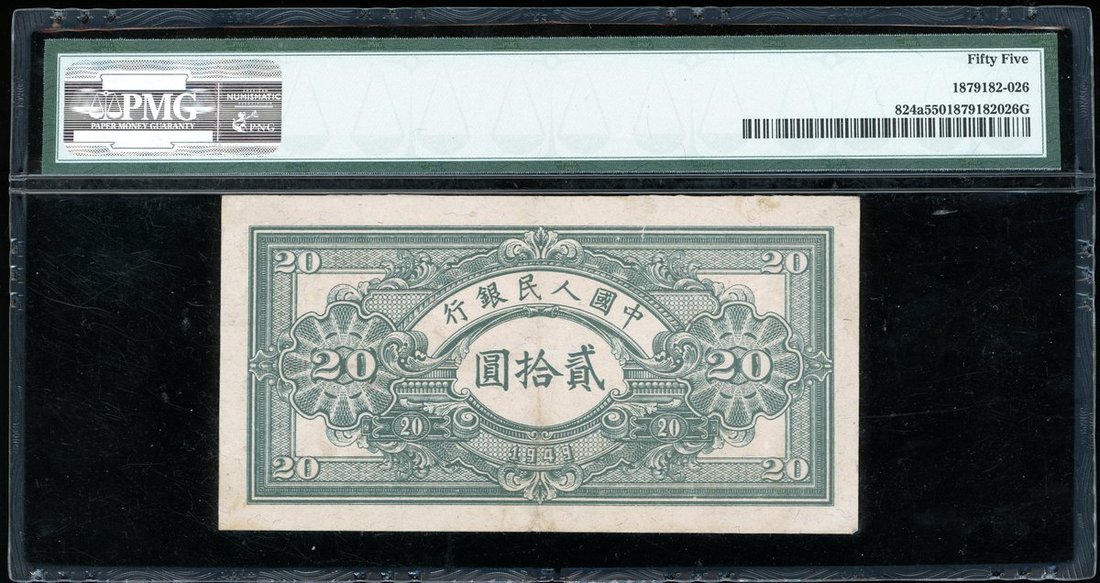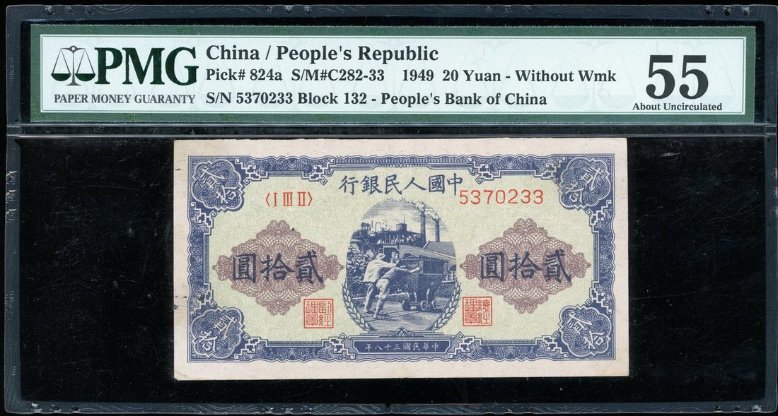 中國人民銀行第一版人民幣20元「推礦車」,編號 5370233,PMG 55