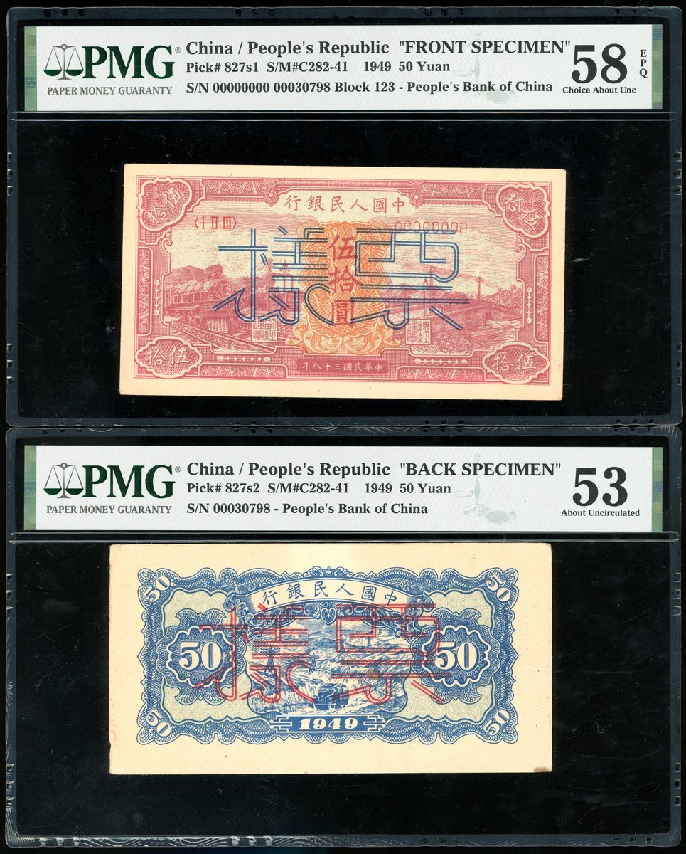 中國人民銀行第一版人民幣50元「紅火車」正反面樣票一對,控號00030798,分別評PMG 58EPQ及53