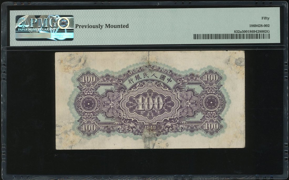 中國人民銀行第一版人民幣100元「藍北海橋」,編號I II IX 506083,PMG50,有貼痕