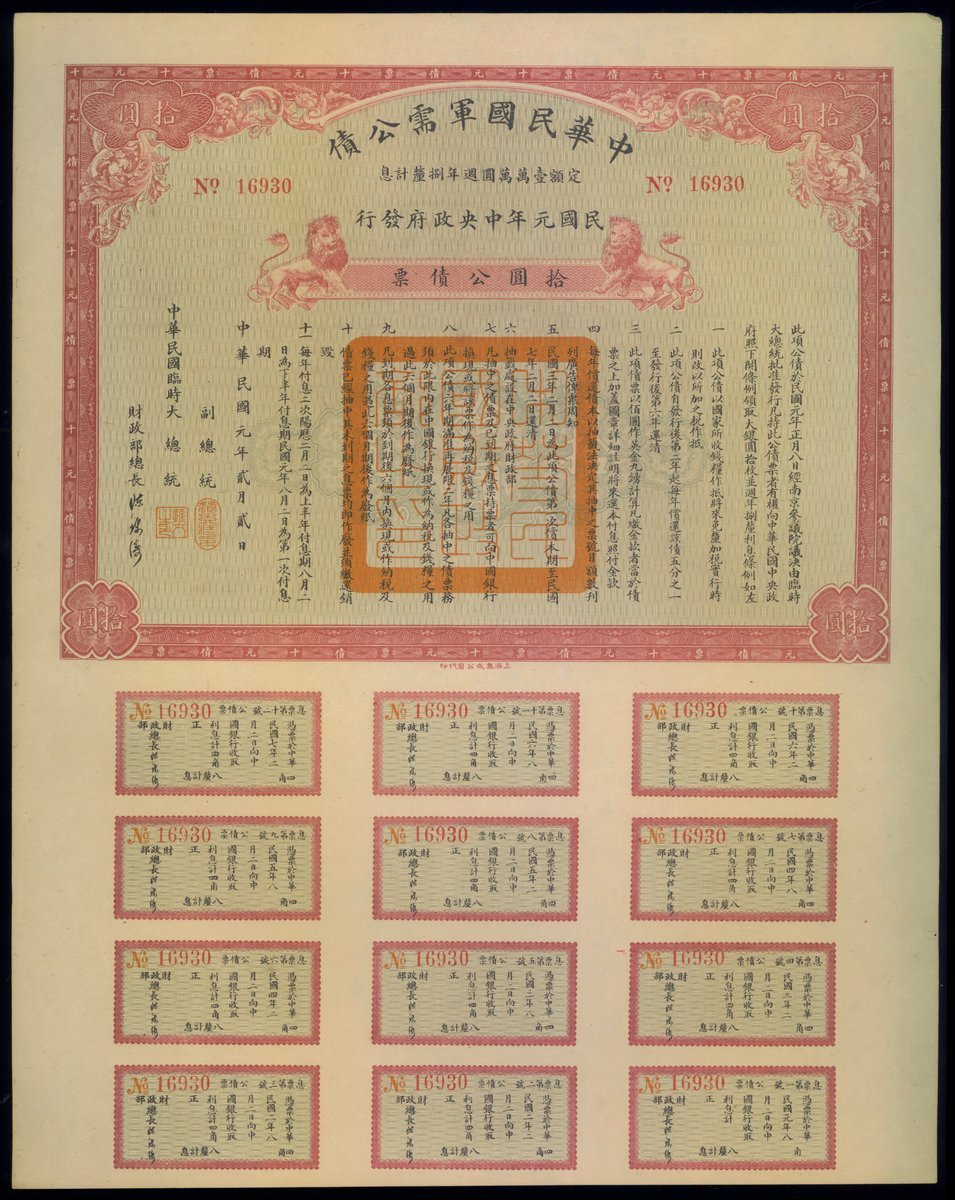 1912年中華民國軍需公債10元,編號16930,VF,附息票