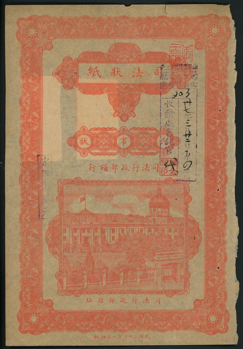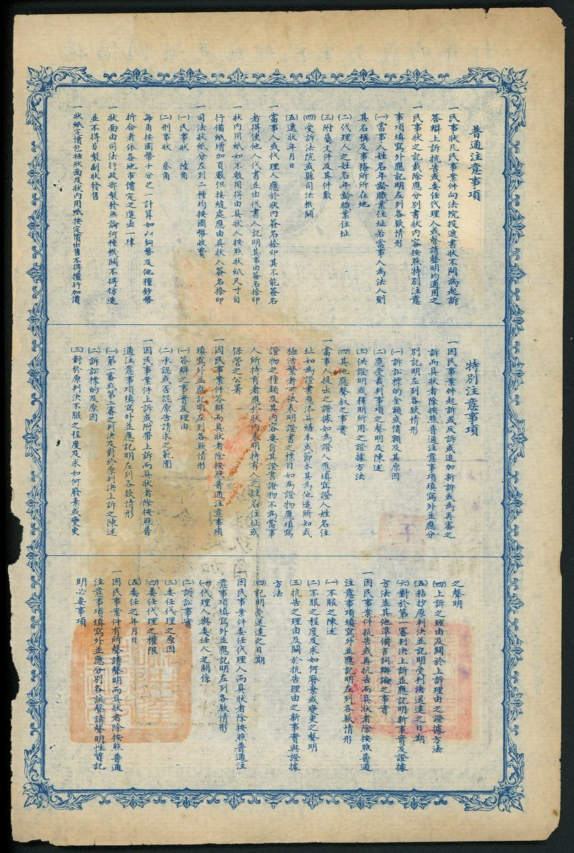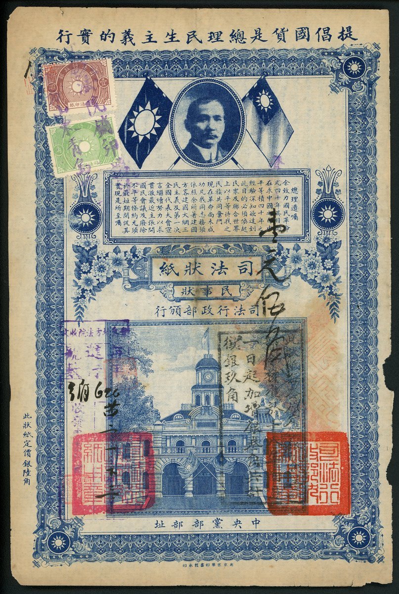 Republican era, a lot of two legal complaint documents, 1935 and 1948, officially printed and sellat fixed price, blue and orange respectively, ornate border and both with vignette of building, the 1935 issue with the portrait of Sun Yat Sen and flags at top centre, both adhesived with revenue stamps, foxing, uneven edges, about very fine.(2)