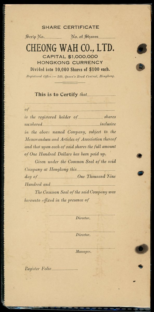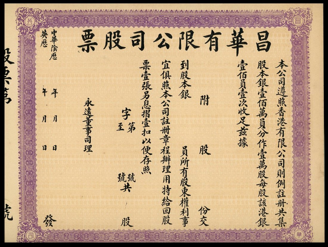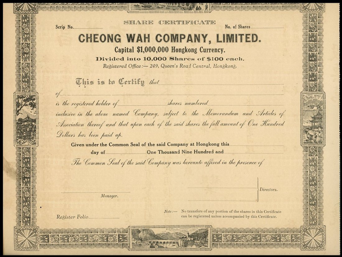 Cheong Wah Company Limited, a remainder of share certificate, ND, purple ornate border, black text, reverse black English text, vignette of Chinese buildings around the border, with counterfoil, tear at top right, very fine.