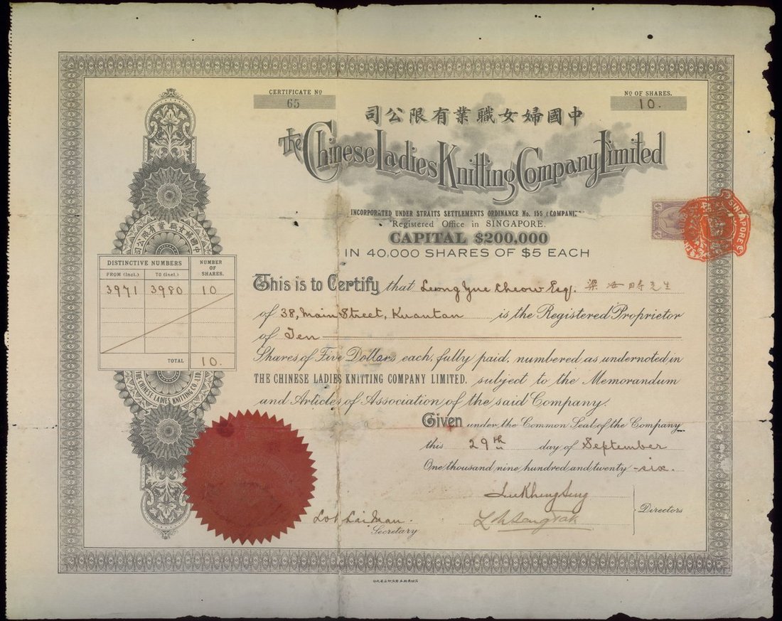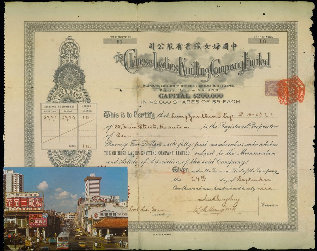 Singapore Straits Settlements, the Chinese Ladies Knitting Company Limited, certificate for 10 shares worth $5 each, 29.9.1929, in business up to July 2020 (voluntary winding up), large size stock certificate measuring 30x38cm, with large red seal at low left, revenue stamp pasted at right border, also a postcard with a photograph of a very busy thoroughfare of New Bridge Road, Singapore,