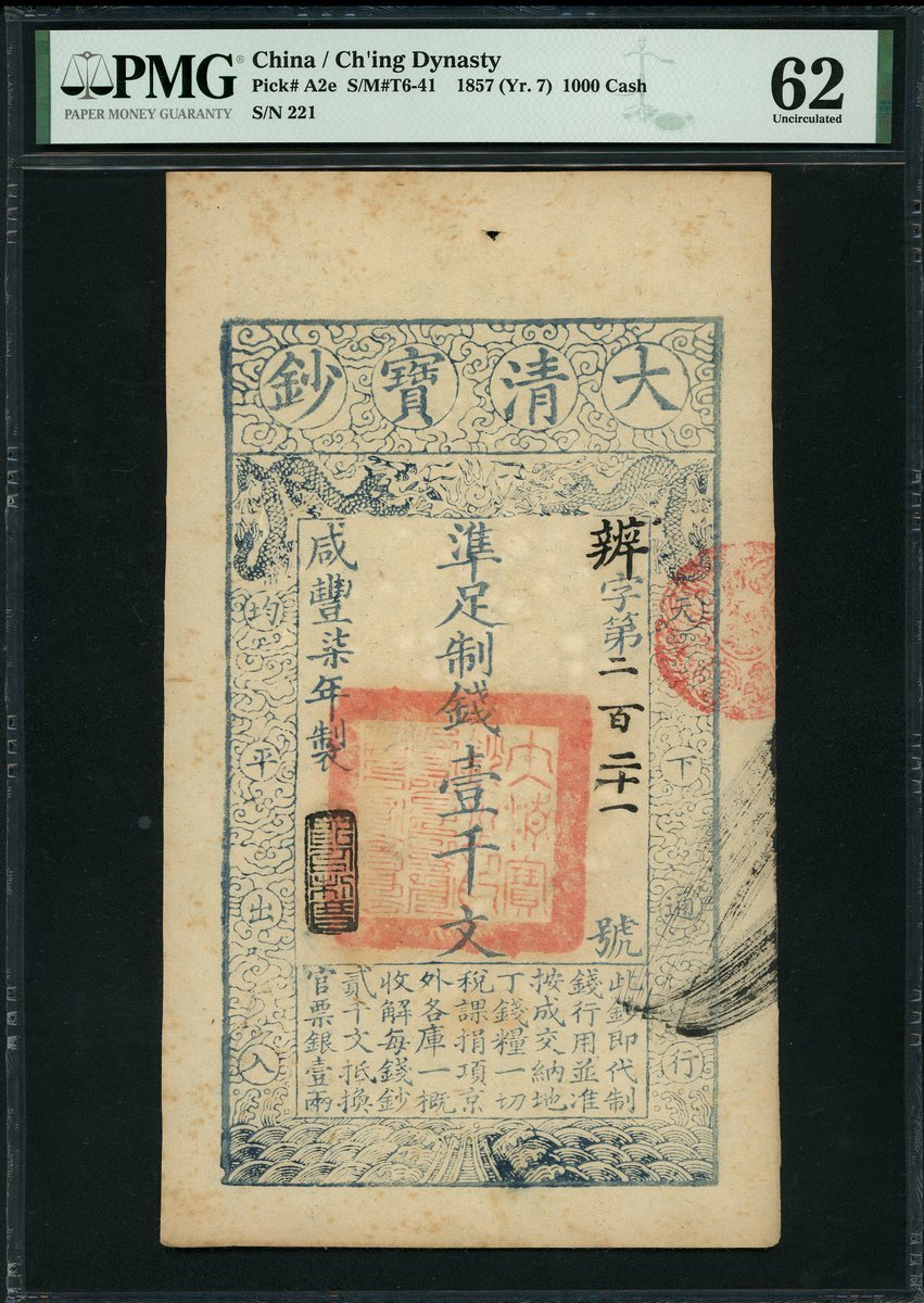 咸豐七年大清寶鈔1000文,編號221,PMG 62,有輕微漬