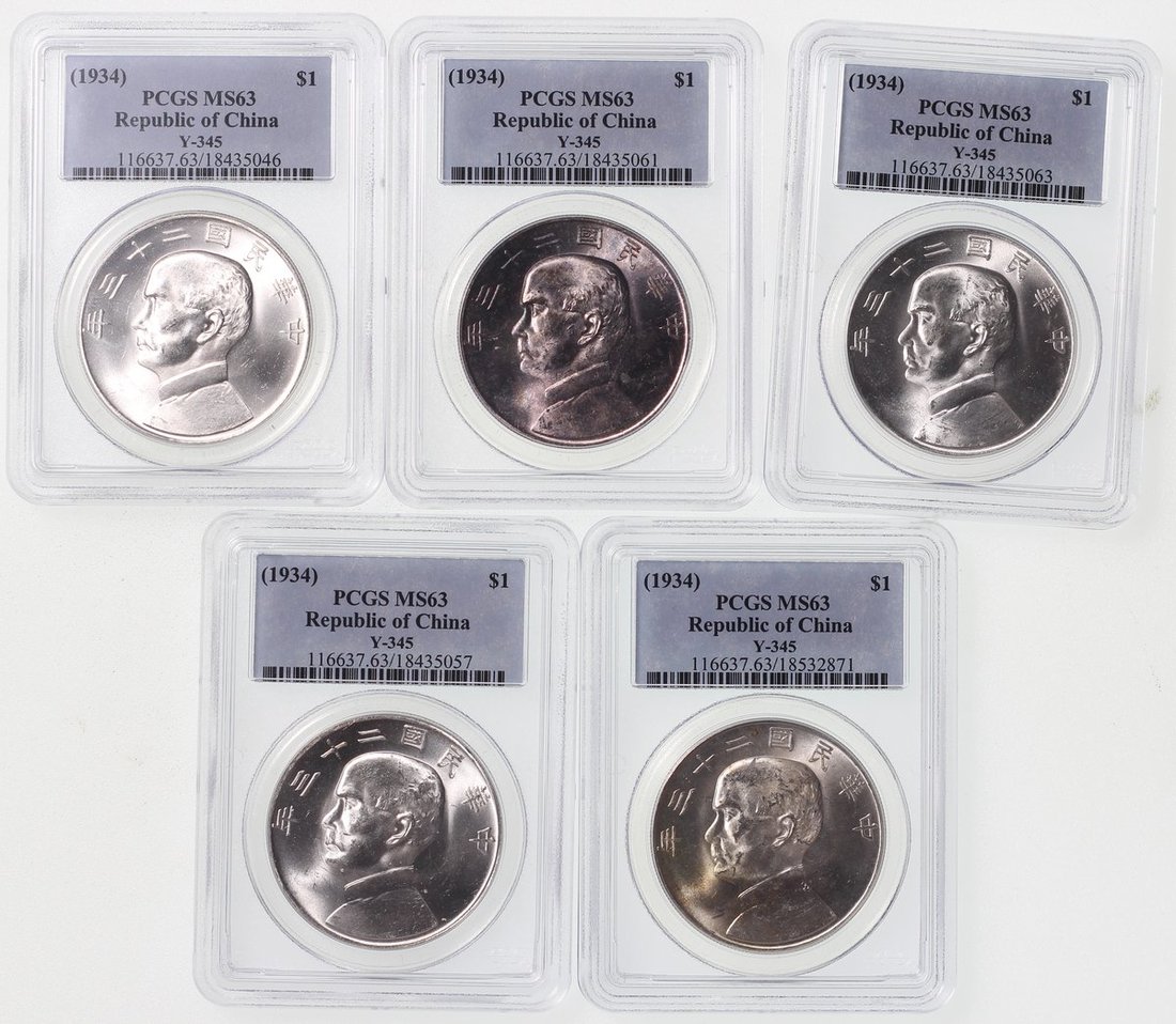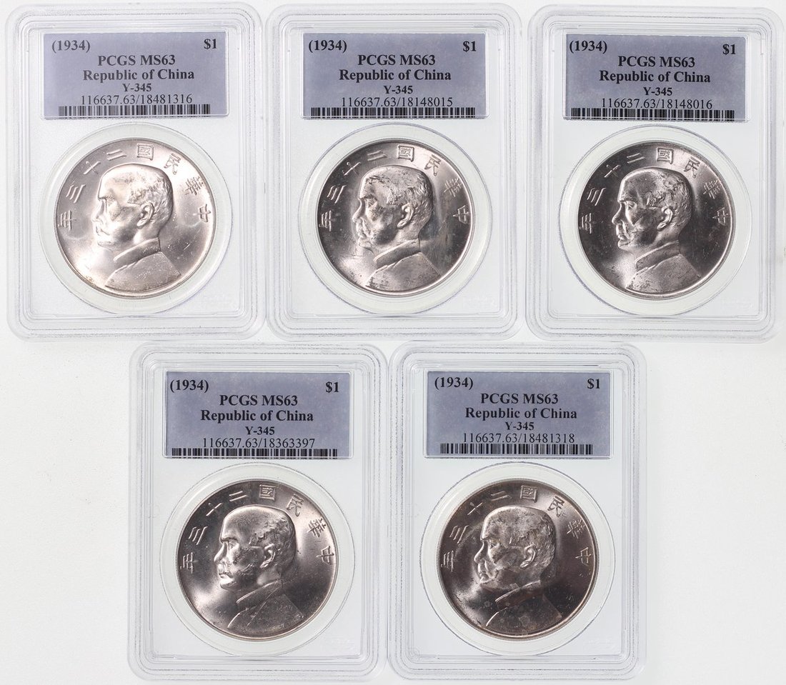 Republic of China, 10x silver $1, 1934, 'Junk' dollar, all graded PCGS MS63 in old labels with good lustre (10)